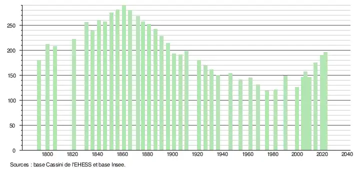 L'évolution du nombre d'habitants est connue à travers les recensements de la population effectués dans la commune depuis 1793. Pour les communes de moins de 10 000 habitants, une enquête de recensement portant sur toute la population est réalisée tous les cinq ans, les populations de référence des années intermédiaires étant quant à elles estimées par interpolation ou extrapolation[30]. Pour la commune, le premier recensement exhaustif entrant dans le cadre du nouveau dispositif a été réalisé en 2004[31].