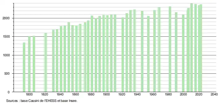 L'évolution du nombre d'habitants est connue à travers les recensements de la population effectués dans la commune depuis 1793. Pour les communes de moins de 10 000 habitants, une enquête de recensement portant sur toute la population est réalisée tous les cinq ans, les populations de référence des années intermédiaires étant quant à elles estimées par interpolation ou extrapolation[21]. Pour la commune, le premier recensement exhaustif entrant dans le cadre du nouveau dispositif a été réalisé en 2005[22].