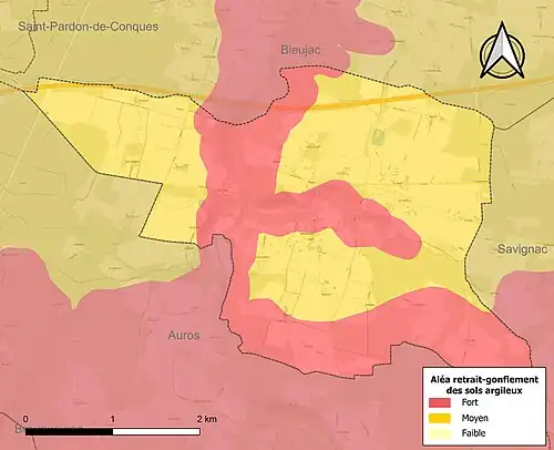 Le retrait-gonflement des sols argileux est susceptible d'engendrer des dommages importants aux bâtiments en cas d’alternance de périodes de sécheresse et de pluie. La totalité de la commune est en aléa moyen ou fort (67,4 % au niveau départemental et 48,5 % au niveau national). Sur les 101 bâtiments dénombrés sur la commune en 2019, 101 sont en aléa moyen ou fort, soit 100 %, à comparer aux 84 % au niveau départemental et 54 % au niveau national. Une cartographie de l'exposition du territoire national au retrait gonflement des sols argileux est disponible sur le site du BRGM[17],[Carte 2].