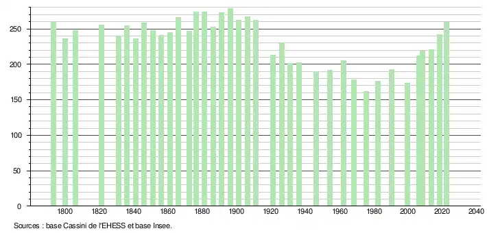 | L'évolution du nombre d'habitants est connue à travers les recensements de la population effectués dans la commune depuis 1793. Pour les communes de moins de 10 000 habitants, une enquête de recensement portant sur toute la population est réalisée tous les cinq ans, les populations de référence des années intermédiaires étant quant à elles estimées par interpolation ou extrapolation[22]. Pour la commune, le premier recensement exhaustif entrant dans le cadre du nouveau dispositif a été réalisé en 2008[23]. En 2022, la commune comptait 259 habitants[Note 3], en évolution de +9,28 % par rapport à 2016 (Gironde : +6,91 %, France hors Mayotte : +2,11 %). |
