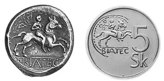 Monnaie originale Biatec et sa réplique moderne sur une pièce de 5 couronnes slovaques.