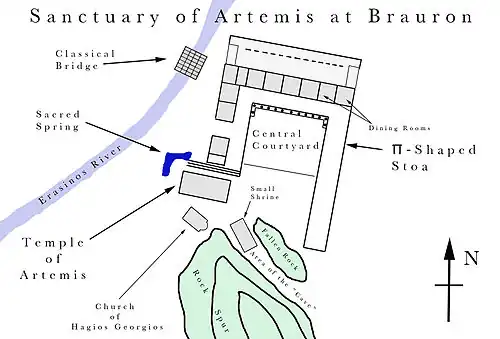 On accédait au sanctuaire, qui couvre une surface d'environ 60 × 80 m, par un pont en dalles de pierre sur le petit fleuve Érasinos : c'est le seul pont qui nous reste de la Grèce classique[1].