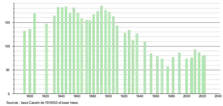 L'évolution du nombre d'habitants est connue à travers les recensements de la population effectués dans la commune depuis 1793. Pour les communes de moins de 10 000 habitants, une enquête de recensement portant sur toute la population est réalisée tous les cinq ans, les populations de référence des années intermédiaires étant quant à elles estimées par interpolation ou extrapolation[25]. Pour la commune, le premier recensement exhaustif entrant dans le cadre du nouveau dispositif a été réalisé en 2005[26].