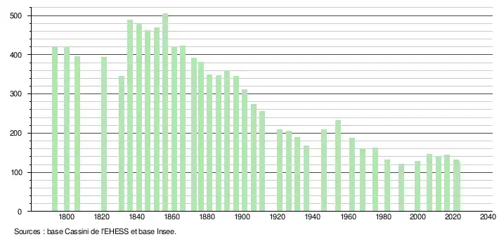 L'évolution du nombre d'habitants est connue à travers les recensements de la population effectués dans la commune depuis 1793. Pour les communes de moins de 10 000 habitants, une enquête de recensement portant sur toute la population est réalisée tous les cinq ans, les populations de référence des années intermédiaires étant quant à elles estimées par interpolation ou extrapolation[17]. Pour la commune, le premier recensement exhaustif entrant dans le cadre du nouveau dispositif a été réalisé en 2006[18].