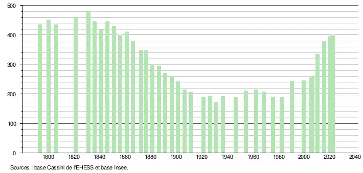 L'évolution du nombre d'habitants est connue à travers les recensements de la population effectués dans la commune depuis 1793. Pour les communes de moins de 10 000 habitants, une enquête de recensement portant sur toute la population est réalisée tous les cinq ans, les populations de référence des années intermédiaires étant quant à elles estimées par interpolation ou extrapolation[20]. Pour la commune, le premier recensement exhaustif entrant dans le cadre du nouveau dispositif a été réalisé en 2005[21].