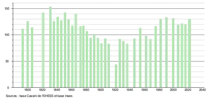 L'évolution du nombre d'habitants est connue à travers les recensements de la population effectués dans la commune depuis 1793. Pour les communes de moins de 10 000 habitants, une enquête de recensement portant sur toute la population est réalisée tous les cinq ans, les populations de référence des années intermédiaires étant quant à elles estimées par interpolation ou extrapolation[26]. Pour la commune, le premier recensement exhaustif entrant dans le cadre du nouveau dispositif a été réalisé en 2006[27].