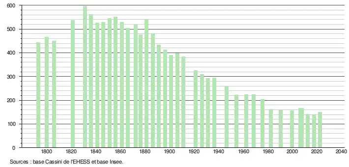 L'évolution du nombre d'habitants est connue à travers les recensements de la population effectués dans la commune depuis 1793. Pour les communes de moins de 10 000 habitants, une enquête de recensement portant sur toute la population est réalisée tous les cinq ans, les populations de référence des années intermédiaires étant quant à elles estimées par interpolation ou extrapolation[13]. Pour la commune, le premier recensement exhaustif entrant dans le cadre du nouveau dispositif a été réalisé en 2007[14].