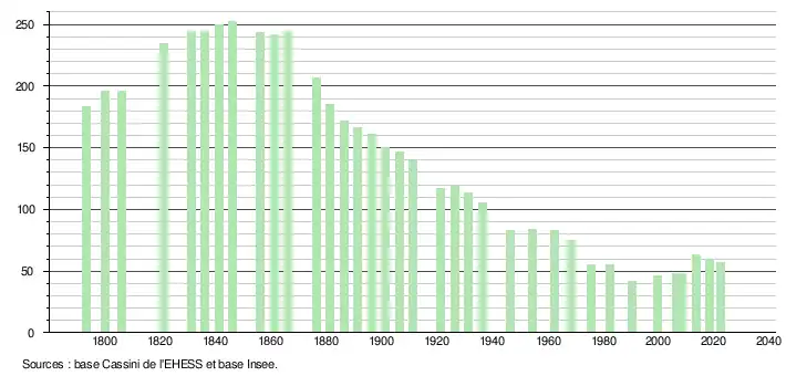 L'évolution du nombre d'habitants est connue à travers les recensements de la population effectués dans la commune depuis 1793. Pour les communes de moins de 10 000 habitants, une enquête de recensement portant sur toute la population est réalisée tous les cinq ans, les populations de référence des années intermédiaires étant quant à elles estimées par interpolation ou extrapolation[53]. Pour la commune, le premier recensement exhaustif entrant dans le cadre du nouveau dispositif a été réalisé en 2008[54].