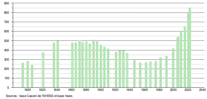 L'évolution du nombre d'habitants est connue à travers les recensements de la population effectués dans la commune depuis 1793. Pour les communes de moins de 10 000 habitants, une enquête de recensement portant sur toute la population est réalisée tous les cinq ans, les populations de référence des années intermédiaires étant quant à elles estimées par interpolation ou extrapolation[27]. Pour la commune, le premier recensement exhaustif entrant dans le cadre du nouveau dispositif a été réalisé en 2005[28].