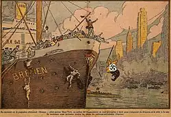 Avec la montée du nazisme, le Bremen à quai à New York, est le théâtre d'une manifestation anti-nazie au cours de laquelle les manifestants décrochent le drapeau nazi et le jettent dans l'Hudson. En réponse à cela, le chancelier Adolf Hitler fait du drapeau nazi le drapeau officiel de l'Allemagne[Information douteuse][7].