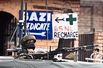 Soldat indien armé d'une MG1B gardant le poste de contrôle routier à l'extérieur de l'aéroport international de Srinagar en .