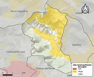 Le retrait-gonflement des sols argileux est susceptible d'engendrer des dommages importants aux bâtiments en cas d’alternance de périodes de sécheresse et de pluie. 43,5 % de la superficie communale est en aléa moyen ou fort (59,3 % au niveau départemental et 48,5 % au niveau national). Sur les 44 bâtiments dénombrés sur la commune en 2019, 39 sont en aléa moyen ou fort, soit 89 %, à comparer aux 85 % au niveau départemental et 54 % au niveau national. Une cartographie de l'exposition du territoire national au retrait gonflement des sols argileux est disponible sur le site du BRGM[20],[Carte 2].