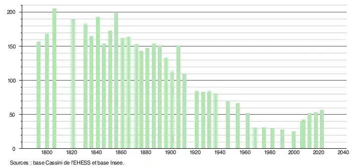 L'évolution du nombre d'habitants est connue à travers les recensements de la population effectués dans la commune depuis 1793. Pour les communes de moins de 10 000 habitants, une enquête de recensement portant sur toute la population est réalisée tous les cinq ans, les populations de référence des années intermédiaires étant quant à elles estimées par interpolation ou extrapolation[24]. Pour la commune, le premier recensement exhaustif entrant dans le cadre du nouveau dispositif a été réalisé en 2007[25].