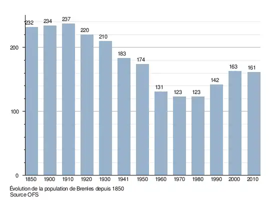 La population de Brenles est 232 habitants en 1850 et elle reste stable jusqu'en 1910. Elle baisse ensuite jusqu'à 123 habitants en 1970 et 1980 avant de remonter à 163 en 2000. de Le graphique suivant résume l'évolution de la population de Brenles entre 1850 et 2010[7] :