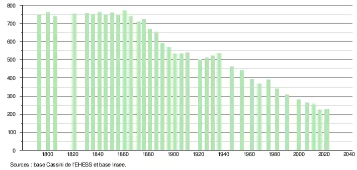 L'évolution du nombre d'habitants est connue à travers les recensements de la population effectués dans la commune depuis 1793. Pour les communes de moins de 10 000 habitants, une enquête de recensement portant sur toute la population est réalisée tous les cinq ans, les populations de référence des années intermédiaires étant quant à elles estimées par interpolation ou extrapolation[15]. Pour la commune, le premier recensement exhaustif entrant dans le cadre du nouveau dispositif a été réalisé en 2006[16].