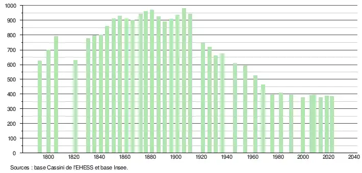 L'évolution du nombre d'habitants est connue à travers les recensements de la population effectués dans la commune depuis 1793. Pour les communes de moins de 10 000 habitants, une enquête de recensement portant sur toute la population est réalisée tous les cinq ans, les populations de référence des années intermédiaires étant quant à elles estimées par interpolation ou extrapolation[20]. Pour la commune, le premier recensement exhaustif entrant dans le cadre du nouveau dispositif a été réalisé en 2008[21].