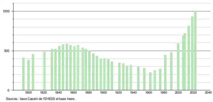 L'évolution du nombre d'habitants est connue à travers les recensements de la population effectués dans la commune depuis 1793. Pour les communes de moins de 10 000 habitants, une enquête de recensement portant sur toute la population est réalisée tous les cinq ans, les populations de référence des années intermédiaires étant quant à elles estimées par interpolation ou extrapolation[15]. Pour la commune, le premier recensement exhaustif entrant dans le cadre du nouveau dispositif a été réalisé en 2008[16].