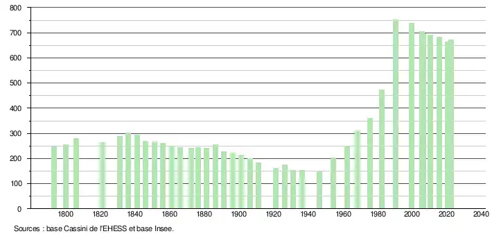 L'évolution du nombre d'habitants est connue à travers les recensements de la population effectués dans la commune depuis 1793. Pour les communes de moins de 10 000 habitants, une enquête de recensement portant sur toute la population est réalisée tous les cinq ans, les populations de référence des années intermédiaires étant quant à elles estimées par interpolation ou extrapolation[18]. Pour la commune, le premier recensement exhaustif entrant dans le cadre du nouveau dispositif a été réalisé en 2005[19].