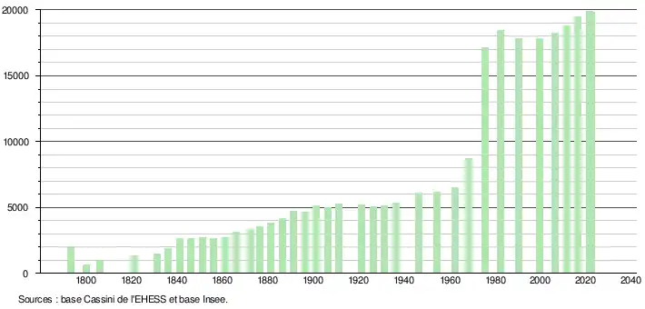 - ↑ Par convention dans Wikipédia, le principe a été retenu de n’afficher dans le tableau des recensements et le graphique, pour les populations de référence postérieures à 1999, que les populations correspondant à une enquête exhaustive de recensement pour les communes de moins de 10 000 habitants, et que les populations des années 2006, 2011, 2016, etc. pour les communes de plus de 10 000 habitants, ainsi que la dernière population de référence publiée par l’Insee pour l'ensemble des communes.