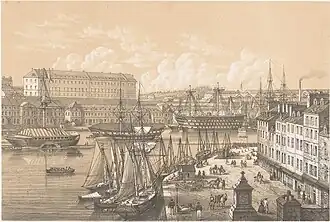 Chateaubriand finit ses études d'officier de Marine à Brest. Il écrit dans Mémoires d'outre-tombe : « Souvent, assis sur quelque mât qui gisait le long du quai de Recouvrance, je regardais les mouvements de la foule : constructeurs, matelots, militaires, douaniers, forçats, passaient et repassaient devant moi. Des voyageurs débarquaient et s’embarquaient, des pilotes commandaient la manœuvre, des charpentiers équarrissaient des pièces de bois, des cordiers filaient des câbles, des mousses allumaient des feux sous des chaudières d’où sortaient une épaisse fumée et la saine odeur du goudron. »