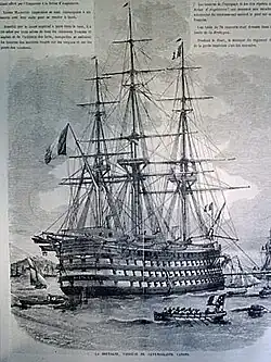 - ↑ Bien que celui-ci comportât une bouche à feu supplémentaire, la Bretagne le surpassait tant par ses dimensions et son déplacement que par sa vitesse et le poids de sa bordée