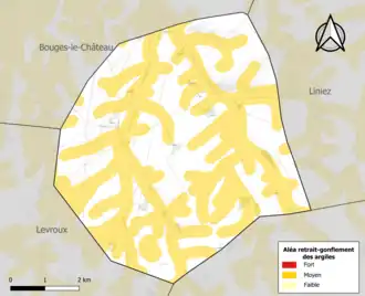Le retrait-gonflement des sols argileux est susceptible d'engendrer des dommages importants aux bâtiments en cas d’alternance de périodes de sécheresse et de pluie. 54,1 % de la superficie communale est en aléa moyen ou fort (84,7 % au niveau départemental et 48,5 % au niveau national). Sur les 77 bâtiments dénombrés sur la commune en 2019, 36 sont en aléa moyen ou fort, soit 47 %, à comparer aux 86 % au niveau départemental et 54 % au niveau national. Une cartographie de l'exposition du territoire national au retrait gonflement des sols argileux est disponible sur le site du BRGM[20],[21].