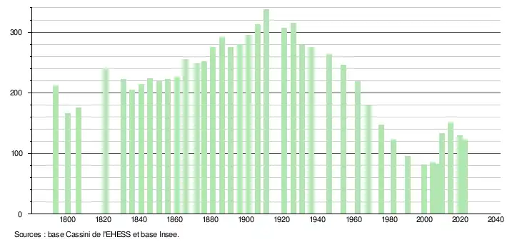 L'évolution du nombre d'habitants est connue à travers les recensements de la population effectués dans la commune depuis 1793. Pour les communes de moins de 10 000 habitants, une enquête de recensement portant sur toute la population est réalisée tous les cinq ans, les populations de référence des années intermédiaires étant quant à elles estimées par interpolation ou extrapolation[26]. Pour la commune, le premier recensement exhaustif entrant dans le cadre du nouveau dispositif a été réalisé en 2004[27].