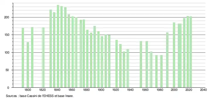 L'évolution du nombre d'habitants est connue à travers les recensements de la population effectués dans la commune depuis 1793. Pour les communes de moins de 10 000 habitants, une enquête de recensement portant sur toute la population est réalisée tous les cinq ans, les populations de référence des années intermédiaires étant quant à elles estimées par interpolation ou extrapolation[22]. Pour la commune, le premier recensement exhaustif entrant dans le cadre du nouveau dispositif a été réalisé en 2008[23].