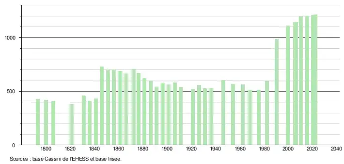 L'évolution du nombre d'habitants est connue à travers les recensements de la population effectués dans la commune depuis 1793. Pour les communes de moins de 10 000 habitants, une enquête de recensement portant sur toute la population est réalisée tous les cinq ans, les populations de référence des années intermédiaires étant quant à elles estimées par interpolation ou extrapolation[21]. Pour la commune, le premier recensement exhaustif entrant dans le cadre du nouveau dispositif a été réalisé en 2005[22].