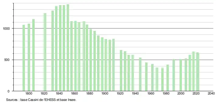 L'évolution du nombre d'habitants est connue à travers les recensements de la population effectués dans la commune depuis 1793. Pour les communes de moins de 10 000 habitants, une enquête de recensement portant sur toute la population est réalisée tous les cinq ans, les populations de référence des années intermédiaires étant quant à elles estimées par interpolation ou extrapolation[23]. Pour la commune, le premier recensement exhaustif entrant dans le cadre du nouveau dispositif a été réalisé en 2006[24].