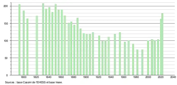 L'évolution du nombre d'habitants est connue à travers les recensements de la population effectués dans la commune depuis 1793. Pour les communes de moins de 10 000 habitants, une enquête de recensement portant sur toute la population est réalisée tous les cinq ans, les populations de référence des années intermédiaires étant quant à elles estimées par interpolation ou extrapolation[17]. Pour la commune, le premier recensement exhaustif entrant dans le cadre du nouveau dispositif a été réalisé en 2005[18].