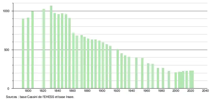L'évolution du nombre d'habitants est connue à travers les recensements de la population effectués dans la commune depuis 1793. Pour les communes de moins de 10 000 habitants, une enquête de recensement portant sur toute la population est réalisée tous les cinq ans, les populations de référence des années intermédiaires étant quant à elles estimées par interpolation ou extrapolation[13]. Pour la commune, le premier recensement exhaustif entrant dans le cadre du nouveau dispositif a été réalisé en 2004[14].