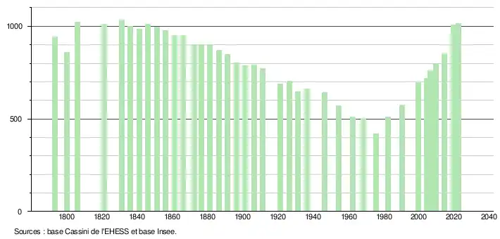 L'évolution du nombre d'habitants est connue à travers les recensements de la population effectués dans la commune depuis 1793. Pour les communes de moins de 10 000 habitants, une enquête de recensement portant sur toute la population est réalisée tous les cinq ans, les populations de référence des années intermédiaires étant quant à elles estimées par interpolation ou extrapolation[19]. Pour la commune, le premier recensement exhaustif entrant dans le cadre du nouveau dispositif a été réalisé en 2004[20].