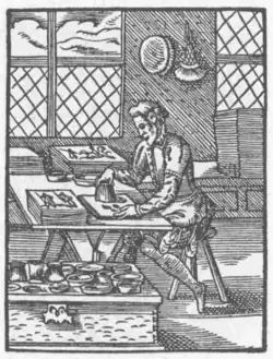 - ↑ En français : « imprimeur de lettres, fabricant de lettres, peintre de cartes, fabricant de cartes, peintre, compositeur et imprimeur d'images de saints ».