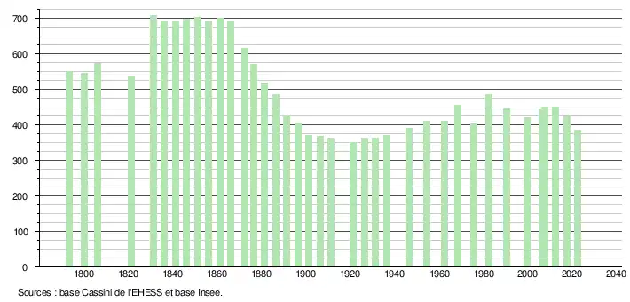 L'évolution du nombre d'habitants est connue à travers les recensements de la population effectués dans la commune depuis 1793. Pour les communes de moins de 10 000 habitants, une enquête de recensement portant sur toute la population est réalisée tous les cinq ans, les populations de référence des années intermédiaires étant quant à elles estimées par interpolation ou extrapolation[23]. Pour la commune, le premier recensement exhaustif entrant dans le cadre du nouveau dispositif a été réalisé en 2007[24].