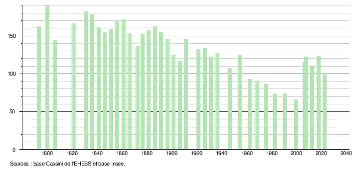 - ↑ Fiches Insee - Populations de référence de la commune pour les années 2006, 2007, 2008, 2009, 2010, 2011, 2012, 2013, 2014, 2015, 2016, 2017, 2018, 2019, 2020, 2021 et 2022.