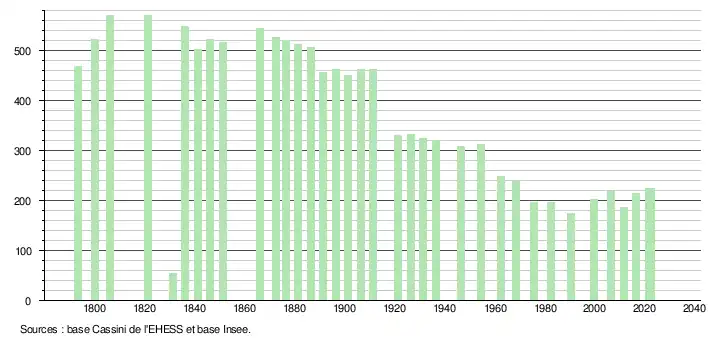 L'évolution du nombre d'habitants est connue à travers les recensements de la population effectués dans la commune depuis 1793. Pour les communes de moins de 10 000 habitants, une enquête de recensement portant sur toute la population est réalisée tous les cinq ans, les populations de référence des années intermédiaires étant quant à elles estimées par interpolation ou extrapolation[23]. Pour la commune, le premier recensement exhaustif entrant dans le cadre du nouveau dispositif a été réalisé en 2006[24].