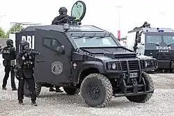 Véhicule blindé de la BRI-PP et équipe d'intervention lors d'une démonstration - juin 2018. Certaines BRI de province sont équipées de fourgons blindés de la Brink's ou de Securitas Mercedes Vario 814/815/816.
