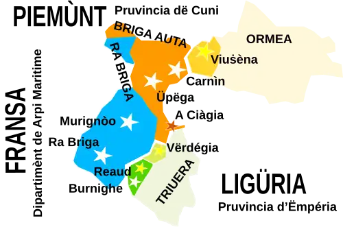 (Note 10) On trouve des traces de la civilisation provençale dans quelques vallées alpines du Piémont [...] En Ligurie on peut reconnaître des traces plus minimes en Basse-Roya (Olivetta San Michele, Airole, Libri) et dans les communes de Rochetta Nervina, Pigna et Triora. » Guido Lucarno, « Le traité de paix de 1947 entre l'Italie et la France. Conséquences sur la frontière et sur le développement de la vallée de la Roya », p. 121 in André-Louis Sanguin, Mare Nostrum : dynamiques et mutations géopolitiques de la Méditerranée, Paris : L'Harmattan, 2000. - ↑ Werner Forner, « La fumée et le feu. À propos des tentatives de délimitation de l’aire occitane sud-orientale. Première partie : De 1850 à 1950 », in P. Fabre (éd.), Mélanges dédiés à la mémoire du Prof. Paul Roux, La Farlède (Association varoise pour l’enseignement du provençal), 1995, pp. 155-180.