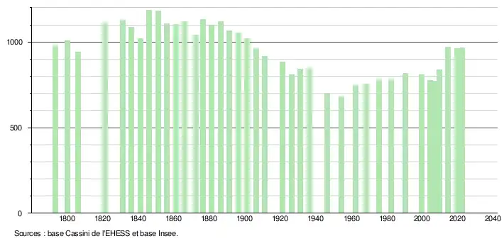 L'évolution du nombre d'habitants est connue à travers les recensements de la population effectués dans la commune depuis 1793. Pour les communes de moins de 10 000 habitants, une enquête de recensement portant sur toute la population est réalisée tous les cinq ans, les populations de référence des années intermédiaires étant quant à elles estimées par interpolation ou extrapolation[22]. Pour la commune, le premier recensement exhaustif entrant dans le cadre du nouveau dispositif a été réalisé en 2004[23].