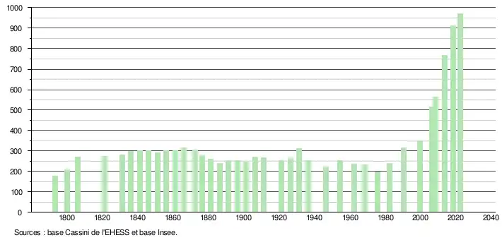 L'évolution du nombre d'habitants est connue à travers les recensements de la population effectués dans la commune depuis 1793. Pour les communes de moins de 10 000 habitants, une enquête de recensement portant sur toute la population est réalisée tous les cinq ans, les populations de référence des années intermédiaires étant quant à elles estimées par interpolation ou extrapolation[21]. Pour la commune, le premier recensement exhaustif entrant dans le cadre du nouveau dispositif a été réalisé en 2008[22].
