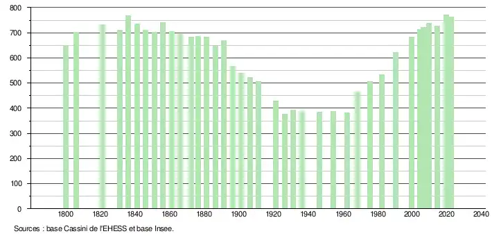 L'évolution du nombre d'habitants est connue à travers les recensements de la population effectués dans la commune depuis 1800. Pour les communes de moins de 10 000 habitants, une enquête de recensement portant sur toute la population est réalisée tous les cinq ans, les populations de référence des années intermédiaires étant quant à elles estimées par interpolation ou extrapolation[19]. Pour la commune, le premier recensement exhaustif entrant dans le cadre du nouveau dispositif a été réalisé en 2004[20].