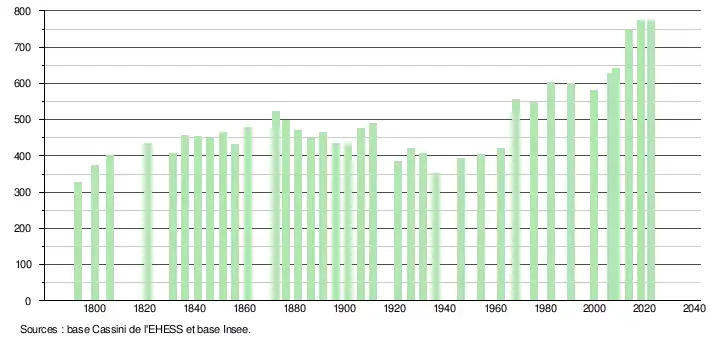 L'évolution du nombre d'habitants est connue à travers les recensements de la population effectués dans la commune depuis 1793. Pour les communes de moins de 10 000 habitants, une enquête de recensement portant sur toute la population est réalisée tous les cinq ans, les populations de référence des années intermédiaires étant quant à elles estimées par interpolation ou extrapolation[22]. Pour la commune, le premier recensement exhaustif entrant dans le cadre du nouveau dispositif a été réalisé en 2008[23].