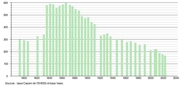 L'évolution du nombre d'habitants est connue à travers les recensements de la population effectués dans la commune depuis 1793. Pour les communes de moins de 10 000 habitants, une enquête de recensement portant sur toute la population est réalisée tous les cinq ans, les populations de référence des années intermédiaires étant quant à elles estimées par interpolation ou extrapolation[17]. Pour la commune, le premier recensement exhaustif entrant dans le cadre du nouveau dispositif a été réalisé en 2008[18].