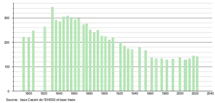 L'évolution du nombre d'habitants est connue à travers les recensements de la population effectués dans la commune depuis 1793. Pour les communes de moins de 10 000 habitants, une enquête de recensement portant sur toute la population est réalisée tous les cinq ans, les populations de référence des années intermédiaires étant quant à elles estimées par interpolation ou extrapolation[16]. Pour la commune, le premier recensement exhaustif entrant dans le cadre du nouveau dispositif a été réalisé en 2007[17].
