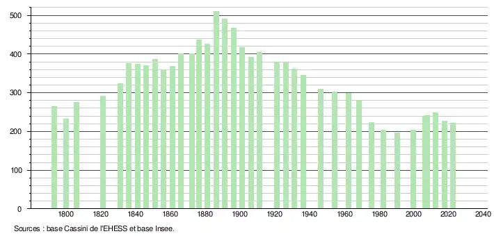 L'évolution du nombre d'habitants est connue à travers les recensements de la population effectués dans la commune depuis 1793. Pour les communes de moins de 10 000 habitants, une enquête de recensement portant sur toute la population est réalisée tous les cinq ans, les populations de référence des années intermédiaires étant quant à elles estimées par interpolation ou extrapolation[25]. Pour la commune, le premier recensement exhaustif entrant dans le cadre du nouveau dispositif a été réalisé en 2007[26].