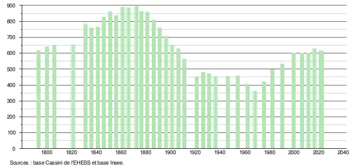 L'évolution du nombre d'habitants est connue à travers les recensements de la population effectués dans la commune depuis 1793. Pour les communes de moins de 10 000 habitants, une enquête de recensement portant sur toute la population est réalisée tous les cinq ans, les populations de référence des années intermédiaires étant quant à elles estimées par interpolation ou extrapolation[13]. Pour la commune, le premier recensement exhaustif entrant dans le cadre du nouveau dispositif a été réalisé en 2006[14].