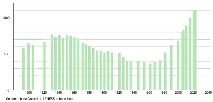 L'évolution du nombre d'habitants est connue à travers les recensements de la population effectués dans la commune depuis 1793. Pour les communes de moins de 10 000 habitants, une enquête de recensement portant sur toute la population est réalisée tous les cinq ans, les populations de référence des années intermédiaires étant quant à elles estimées par interpolation ou extrapolation[21]. Pour la commune, le premier recensement exhaustif entrant dans le cadre du nouveau dispositif a été réalisé en 2005[22].
