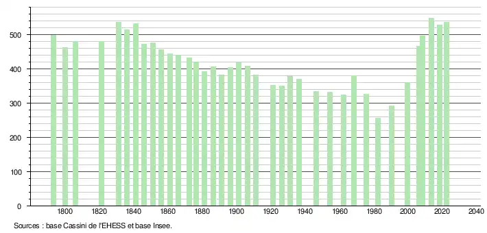 L'évolution du nombre d'habitants est connue à travers les recensements de la population effectués dans la commune depuis 1793. Pour les communes de moins de 10 000 habitants, une enquête de recensement portant sur toute la population est réalisée tous les cinq ans, les populations de référence des années intermédiaires étant quant à elles estimées par interpolation ou extrapolation[23]. Pour la commune, le premier recensement exhaustif entrant dans le cadre du nouveau dispositif a été réalisé en 2008[24].