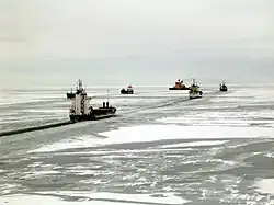 Un système de convoi est utilisé lorsque plusieurs navires se dirigent dans la même direction au sein d'une même zone. Le brise-glace ordonne alors aux navires de rejoindre un point particulier. Lorsque tous les navires s'y sont rendus, le brise-glace arrive à son tour et crée un chenal par lequel les navires peuvent le suivre. La progression se fait ensuite de la même façon que pour une assistance individuelle. Si l'un des navires du convoi se retrouve bloqué par la glace, le brise-glace doit évaluer s'il est opportun de faire demi-tour pour aller le débloquer. Si l'on estime qu'il y a un risque pour que les autres navires du convoi se retrouvent bloqués pendant le temps où ils doivent avancer sans brise-glace devant eux, le navire pris dans les glaces est abandonné provisoirement. Ceci peut être frustrant pour les navires qui se trouvent en queue de convoi et qui se retrouvent contraints à l'arrêt simplement parce qu'un navire devant eux est bloqué.